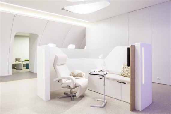 The challenge is to put a maximum number of people in the same room without decreasing the comfort of the patient or the efficiency of the nursing staff. PRoF has found an innovative solution that is similar to business seats in airplanes and meets the PRoF key requirements: privacy, safety, flexibility, comfort, non-stigmatizing and intergenerational. The concept is a half-open cocoon in which the staff keeps track of the situation in the different units without limiting the patient’s necessary privacy and comfort.