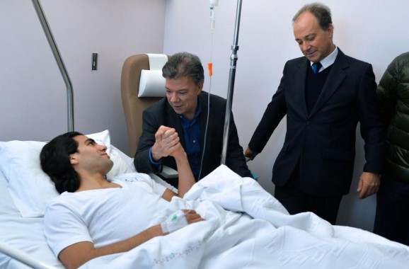 Le président Santos a visité el tigre après son opération au genou gauche à l'hôpital de Trindade à Porto, Portugal. L’opération a été un grand succès. Le tête-à-tête entre Santos et Falcao dans le fauteuil Fero semblait très agrèable. Ils discutaient sans doute la participation de Falcao à la Coupe du Monde au Brésil cet été.