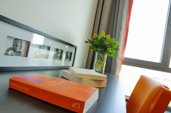 Dankzij het overvloedige licht komen de frisse kleuren van de Talo stoelen (feloranje, lichtgroen en turkooisblauw) mooi tot hun recht. Voor het overige meubilair (bed, nachttafel, bureau, Flat tafels, (relax)zetels) koos de architect in samenspraak met de bouwheer voor het donkere wengé hout.